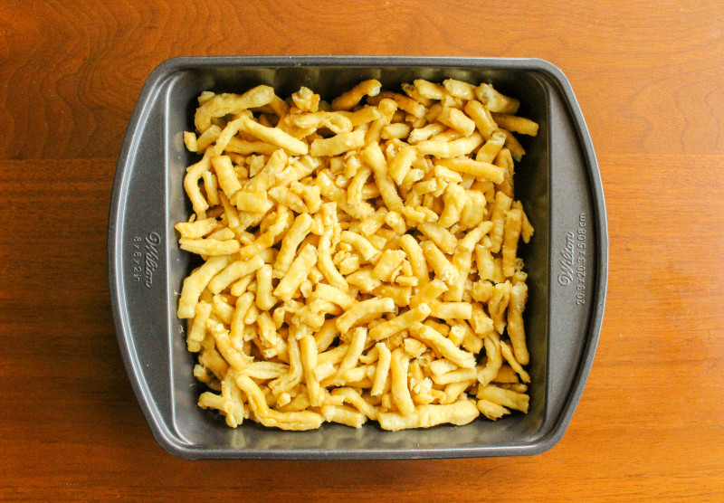 Take the foil off, and if you can easily pull a noodle out, drizzle the rest of the sugar-honey syrup over the sachima.
