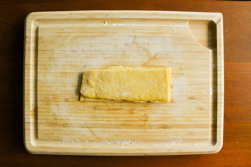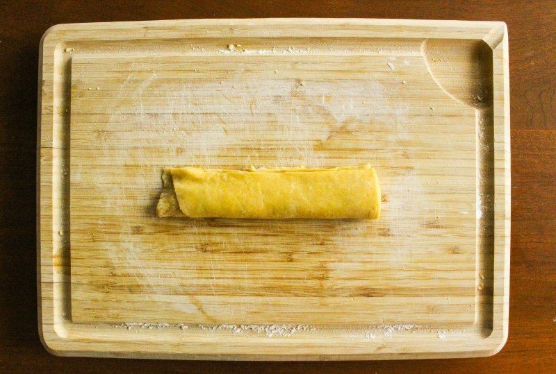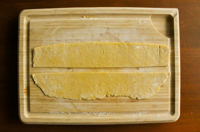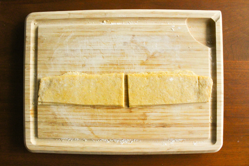 Put one half aside, and roll the other half so that it covers the full cutting board. Then cut in half lengthwise.