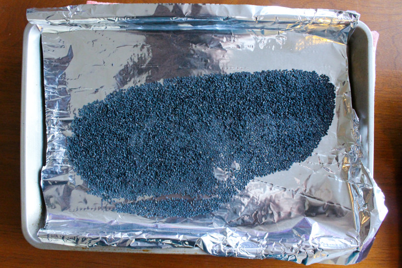 Spread the baked sesame seeds to cover the bottom of an 8x8 cake pan. Save ~2 tbsp for the end.