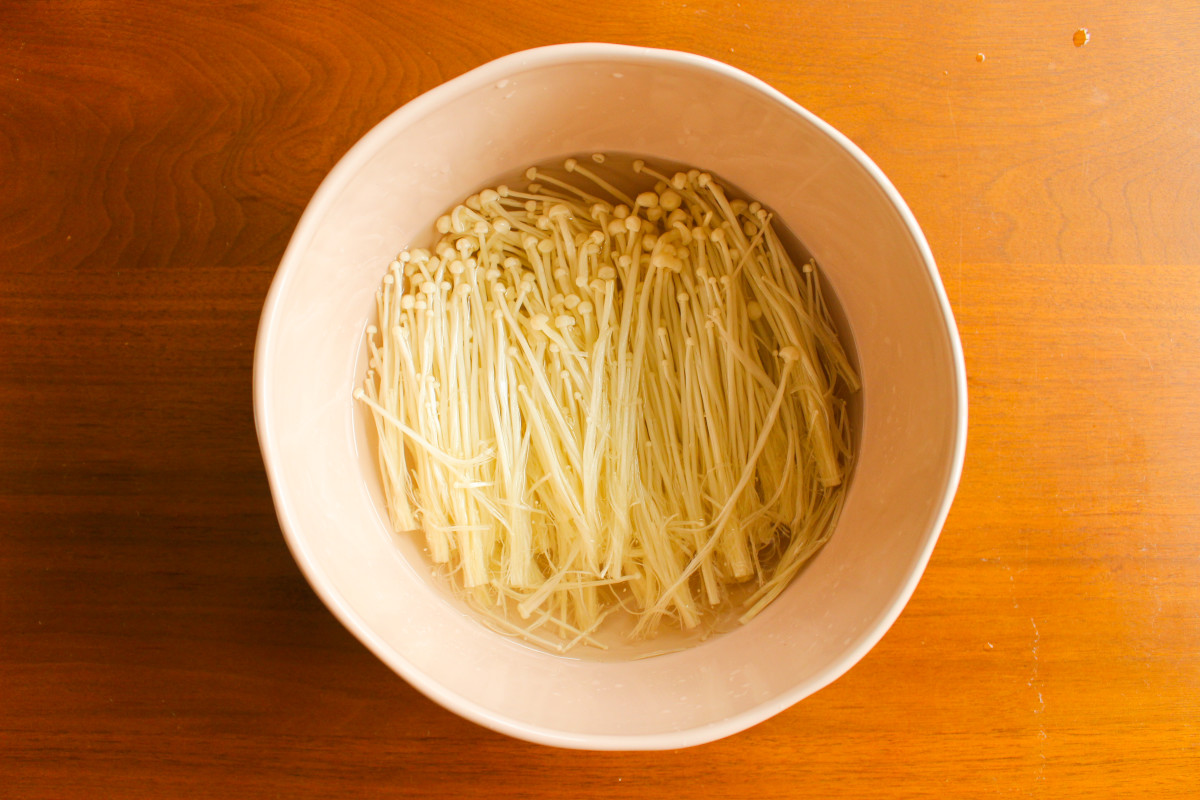 Cut open the package of enoki mushrooms while also cutting the roots off.