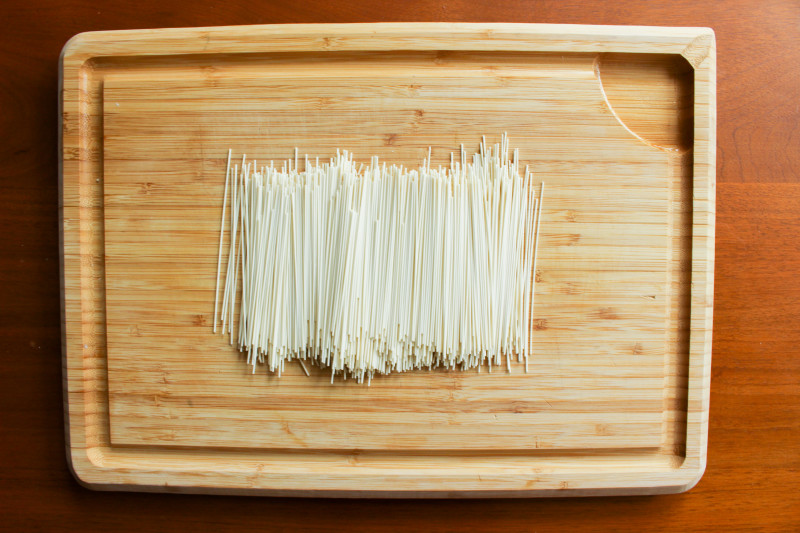 Take a handful of noodles and snap them in half. Do this with all the noodles.