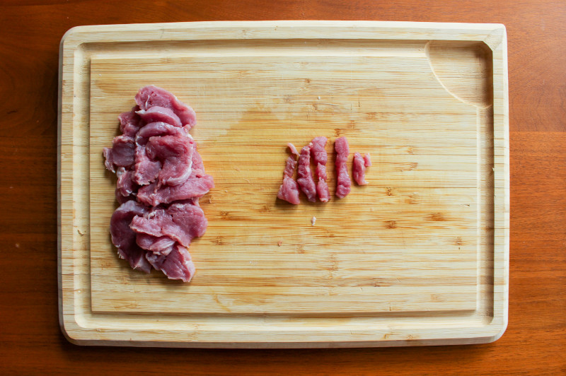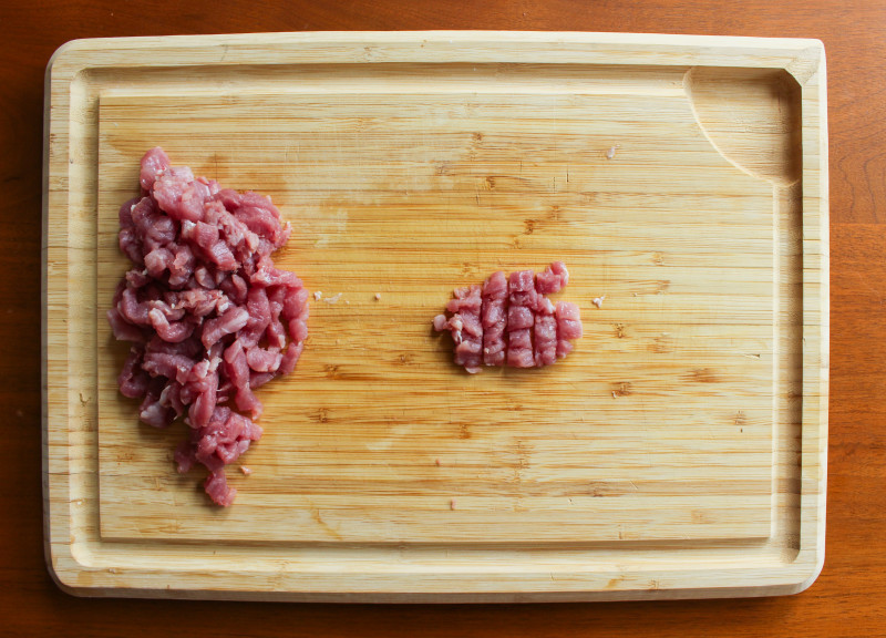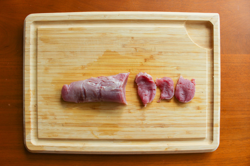 Wash beef or pork tenderloin and then slice into thin rounds. Slice each round into thin strips. If you want smaller pieces, you can then mince each strip.