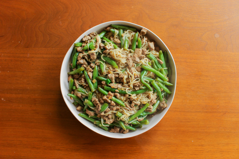 Add dark soy sauce, green beans, and another pinch of salt.