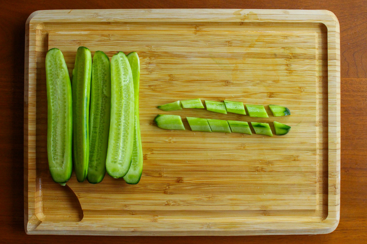 Cut the ends off each cucumber, then cut each cucumber once lengthwise, and then cut each piece lengthwise again.