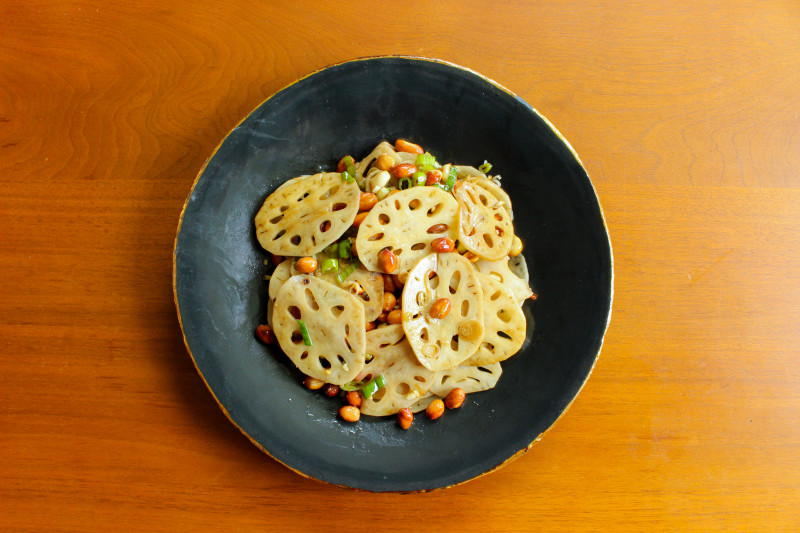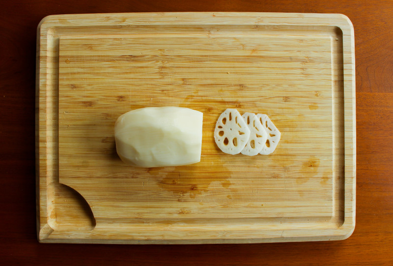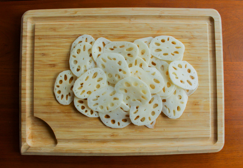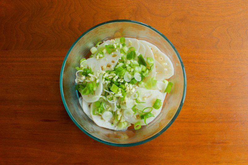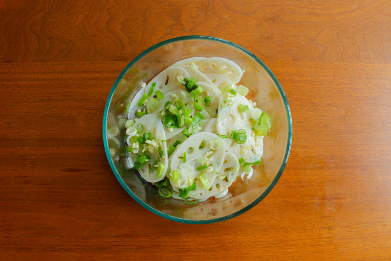 Let boil for 4 minutes, then strain the lotus root slices into a mixing bowl.
