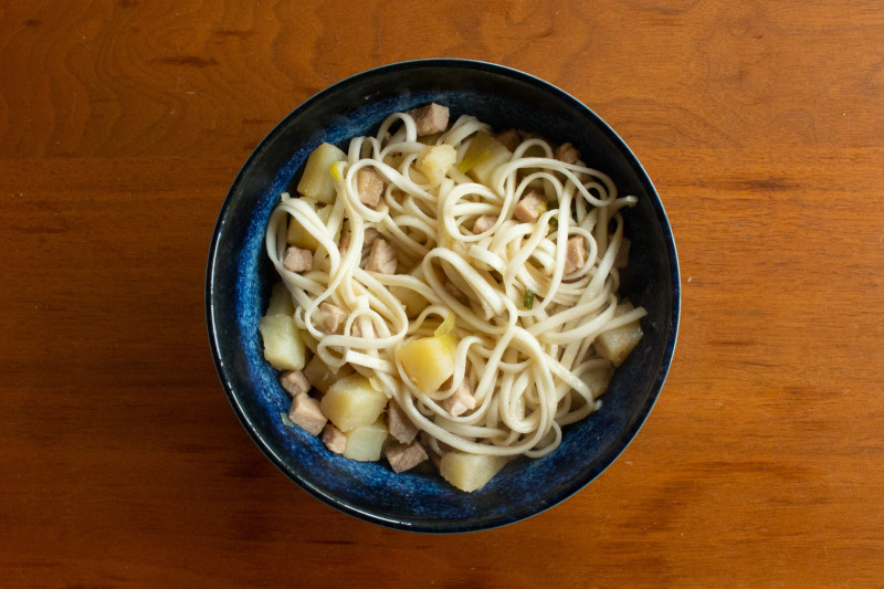 Once there is a thin layer of sauce left in the pan, add the chopped green onion and the potato. Stir well.