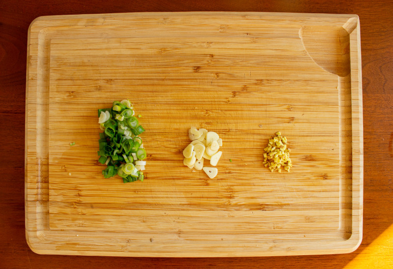 Add green onion, garlic, and 1/2 tbsp light soy sauce.