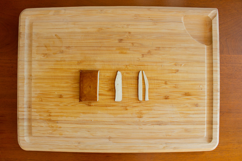 Lay each section flat, and then cut into thin slices - you'll end up with parallelograms.
