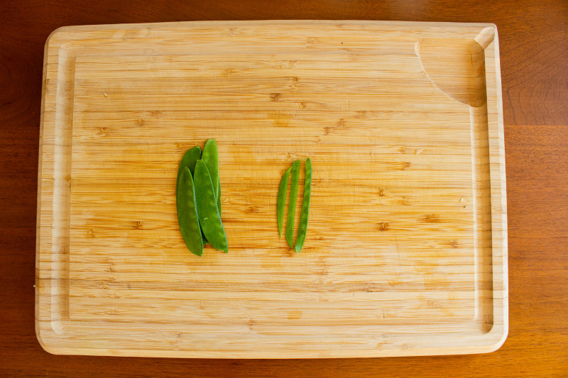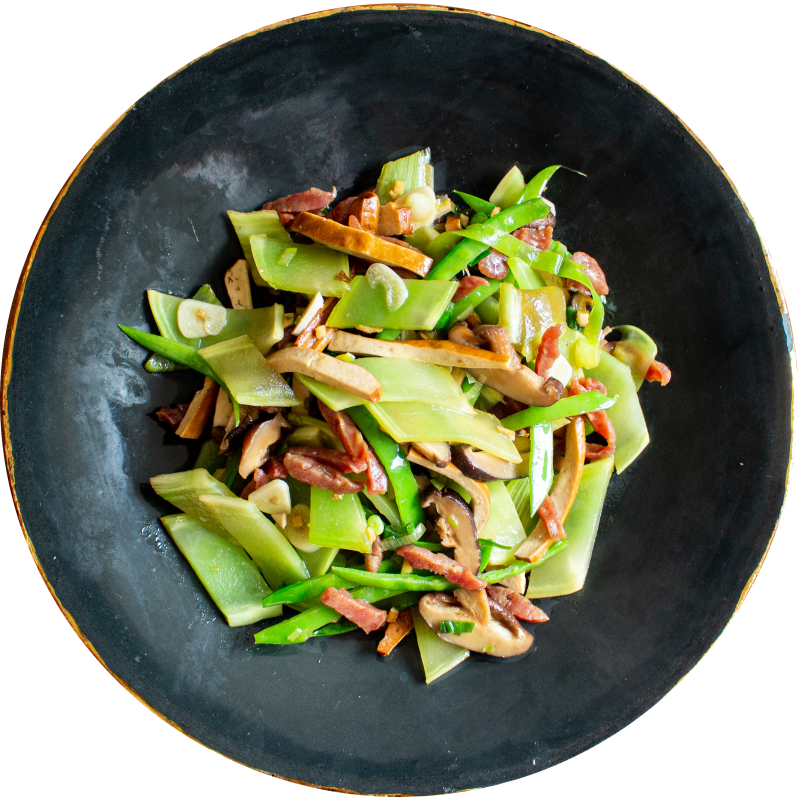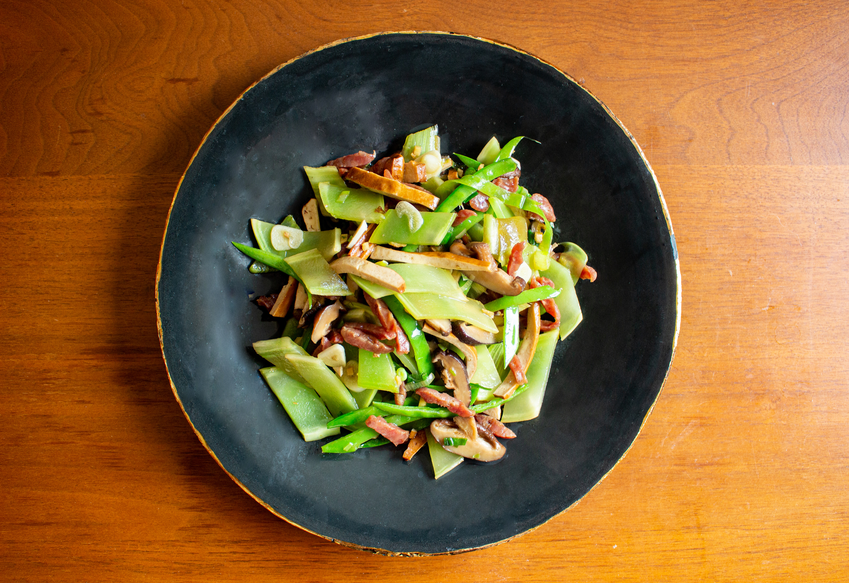 Stir for 1 minute, and then add the Chinese lettuce root and snow peas. Stir for another minute.