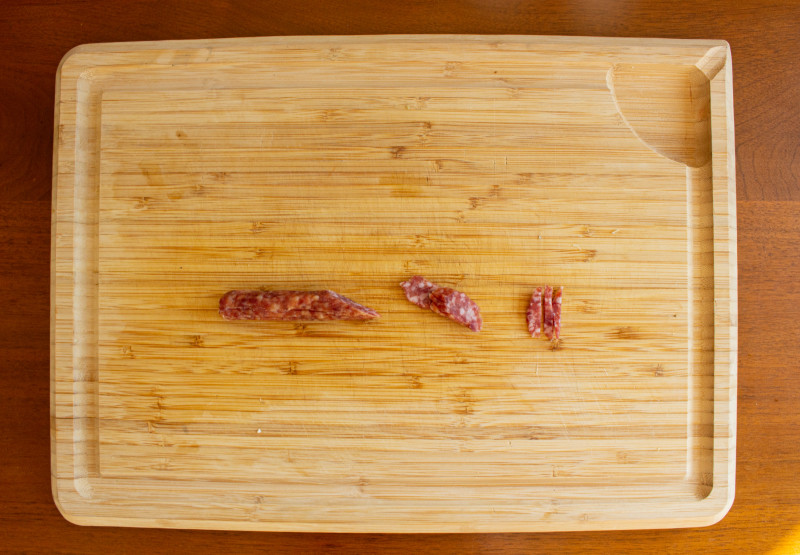 Once the Cantonese sausage is soft, cut into thin slices diagonally.
