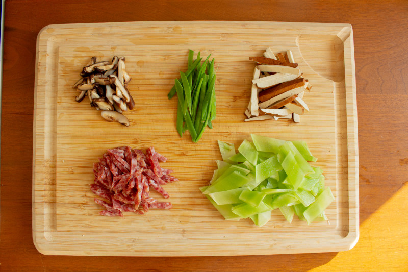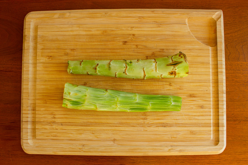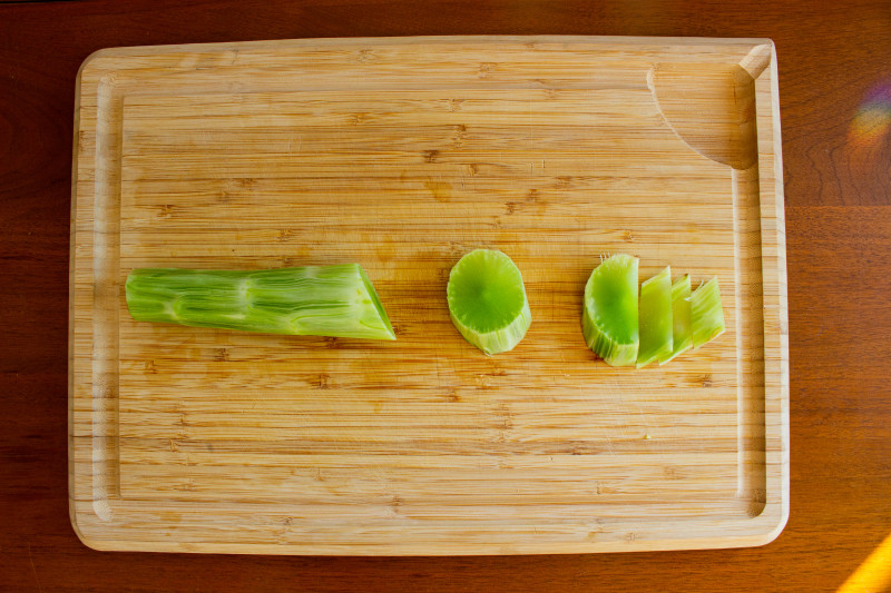 Trim the Chinese lettuce root leaves and ends off, wash it, and then cut into 2-inch sections diagonally.