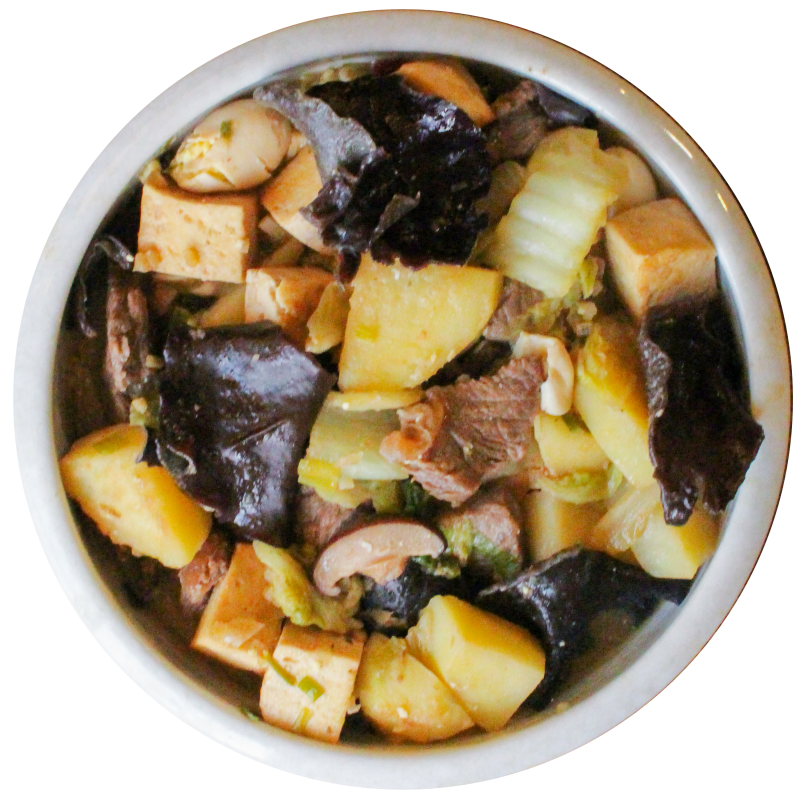 Add quail eggs, fried tofu, fried potato, and ginseng slices.