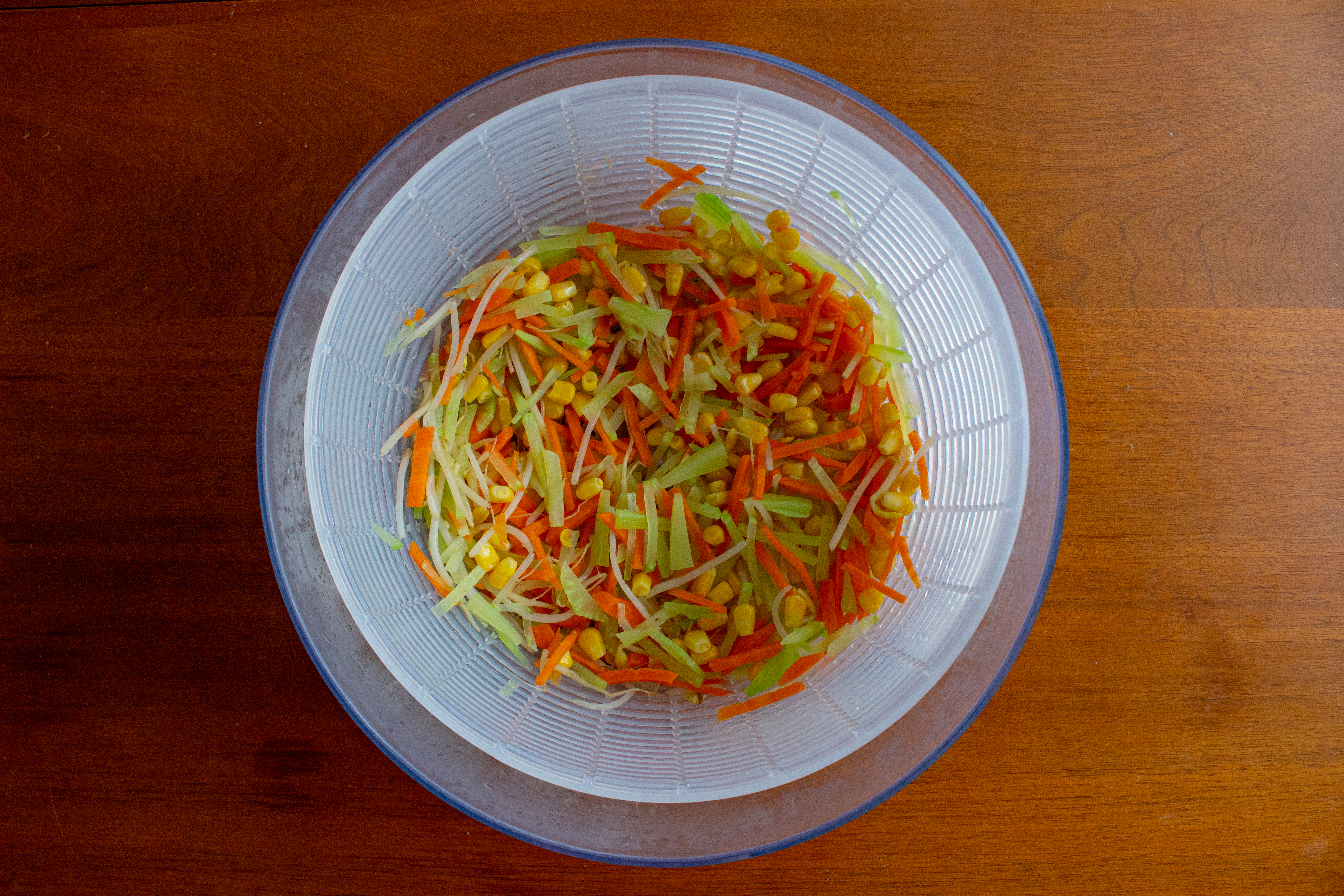 We want to remove as much water from the veggies as possible - if you have a salad spinner, use it. If not, put on some gloves, carefully grab a handful of the veggies, and squeeze as much water out as you can.