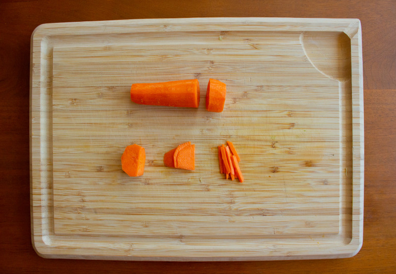 Similarly, cut the carrot into 1-2 inch sections, then slice each section into thin slices, and each slice into thin strips.