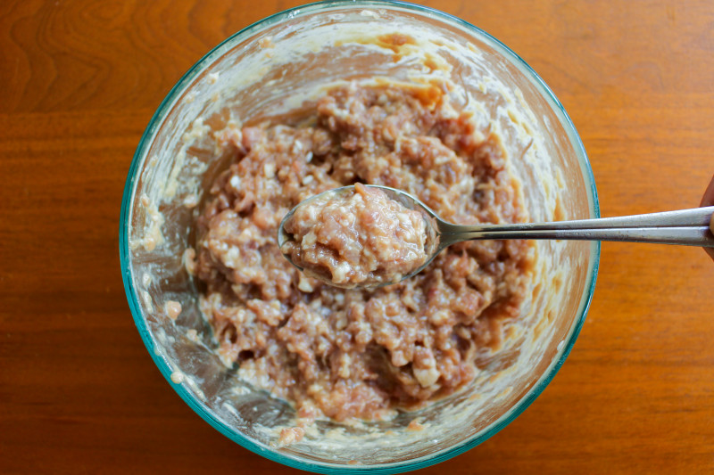 Use a spoon to scoop out a small amount of the ground meat mixture. You need less than you think (but if you want bigger meatballs, go for it).