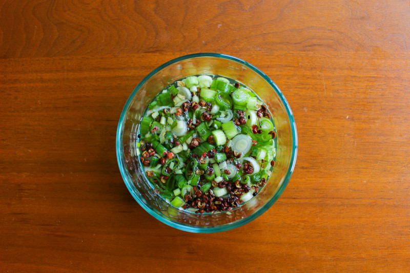 In a small bowl, add the Sichuan peppercorns, minced ginger, chopped green onion, black peppercorns, and warm water. Soak for 30 minutes. This is our "spice water."