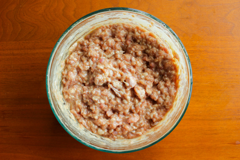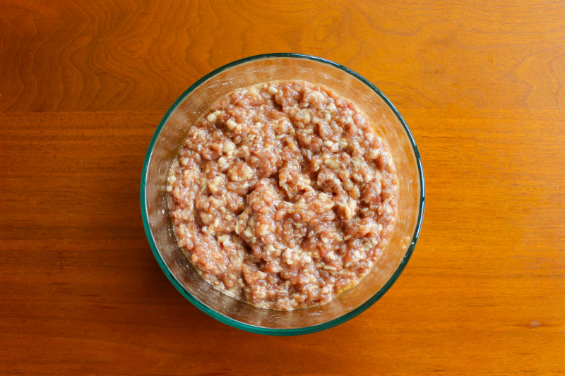 In a mixing bowl, add the ground pork (or ground chicken) and egg whites.