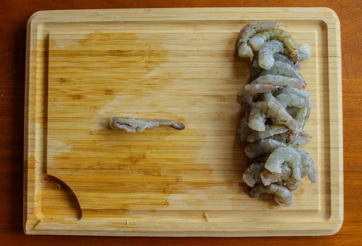 If the shrimp are already peeled and deveined with the tails removed, skip to Step 5 (make sure you double-check that both the top and bottom of the shrimp are missing the black vein).