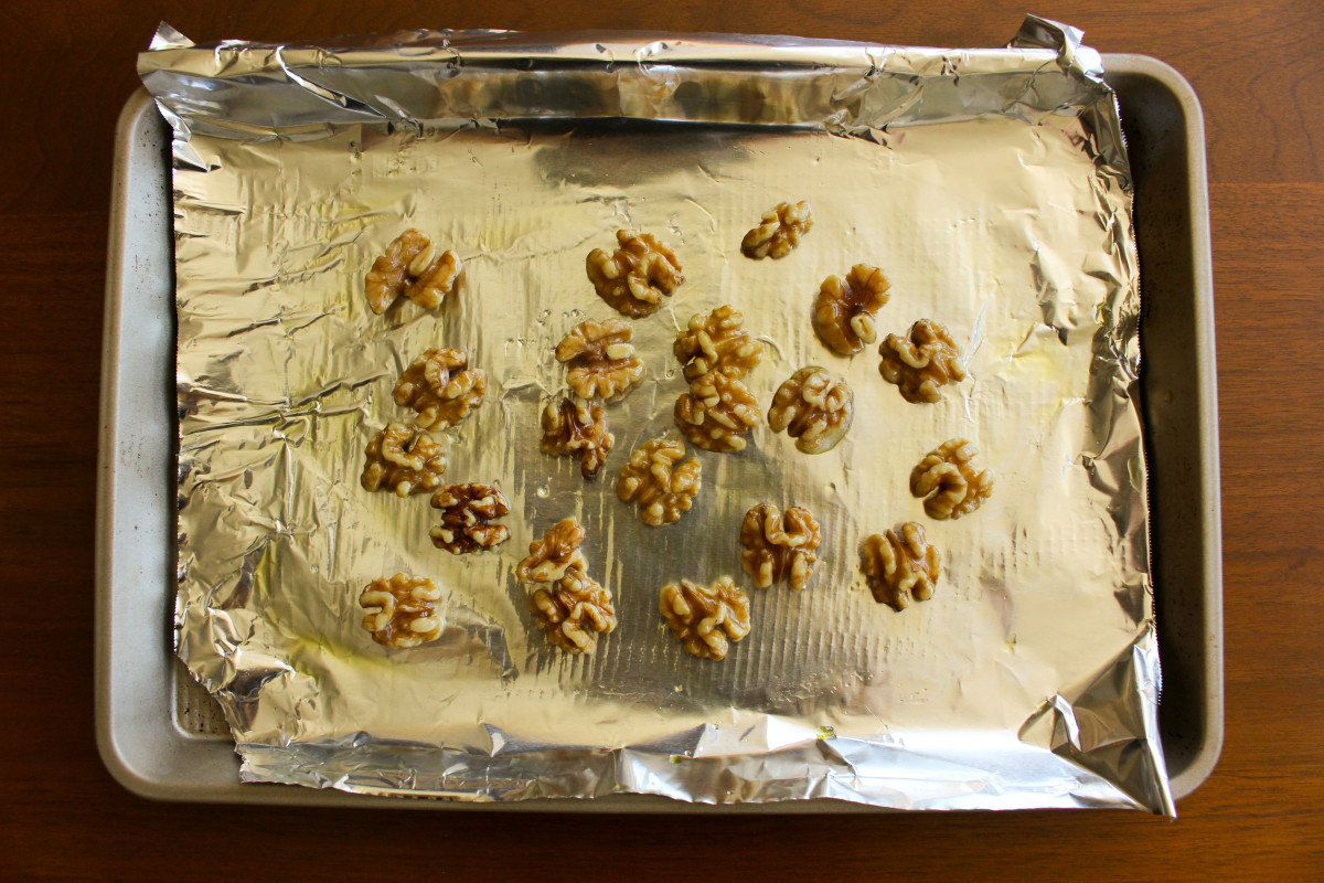 Heat the saved sugar from the candied walnut process with 1 tbsp olive oil.