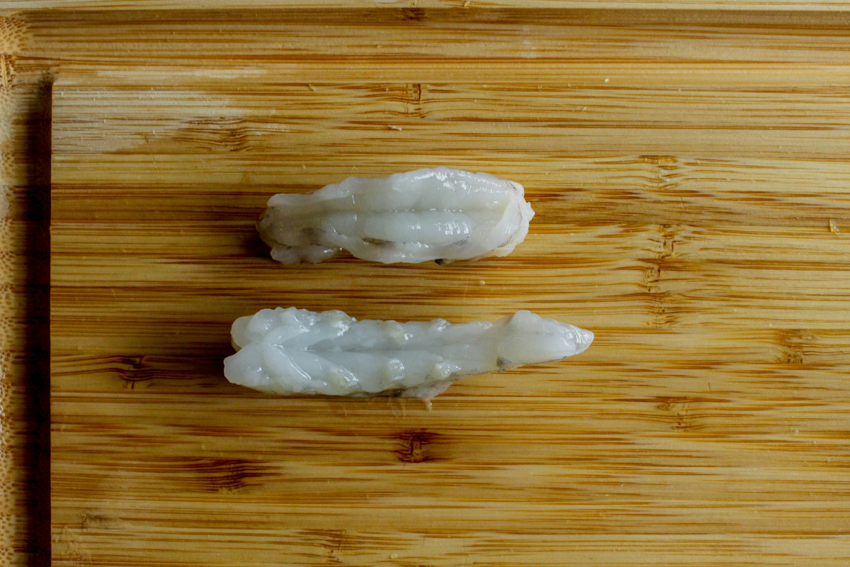 Next, we need to devein the shrimp. Use a small knife to make a cut on the top and bottom of the shrimp. Remove the black vein from both the top and bottom.
