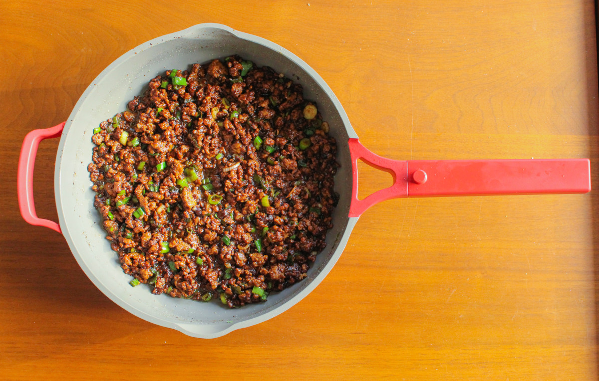 Separately, heat a pan over medium-high heat and add in the olive oil and ground pork. You can also use ground beef if you like!