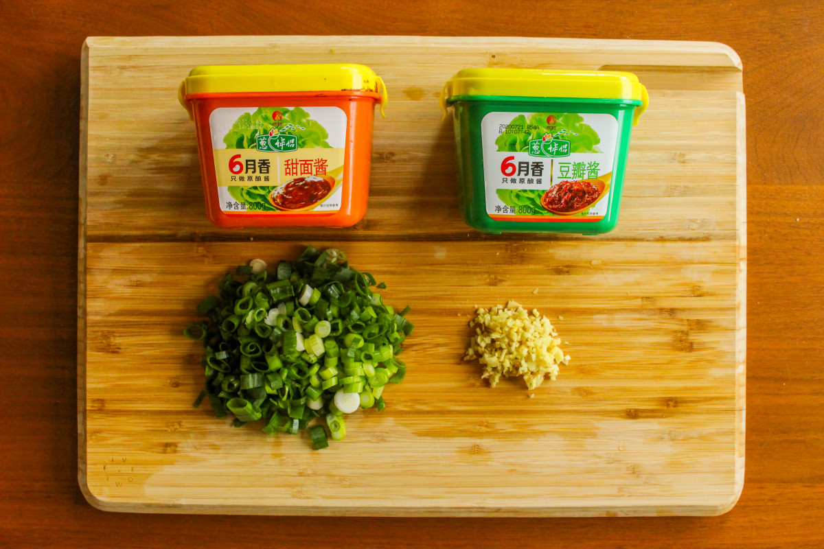 Mince your slices of ginger and chop up the green onion - these will go in our sauce along with the two pastes pictured.
